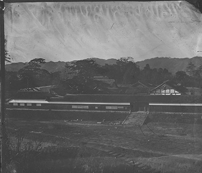 | 見どころ・解説 | 明治6年(1873)に旧上野城の本丸高石垣から藤堂藩主の館舎であった御屋敷(御殿)を撮影したものである。原板はコロジオン湿板写真ガラスネガで、東京大学史料編纂所の調査によってデジタル化された。この写真は、かつて伊賀史談会から絵葉書として発行されているが、より高精細な画像となったことで、檜皮や瓦など建物ごとに異なる御屋敷の屋根の構造、門扉に付けられた金具の形状に至るまでを確認できるようになった。また、絵葉書では切り取られていた画像の下部に、御屋敷と道を挟んで対面にある内堀へと下りる階段の存在が確認できた。 |