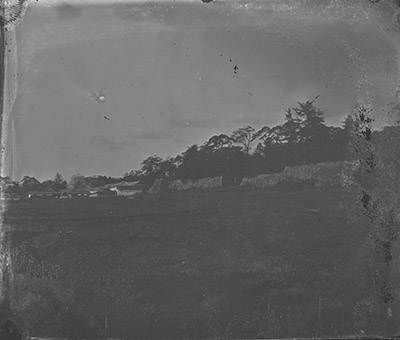 | 見どころ・解説 | 明治6年(1873)頃に旧上野城の本丸正面(南側)に残る石垣を撮影したものである。原板はコロジオン湿板写真ガラスネガで、東京大学史料編纂所の調査によってデジタル化された。手前に広がるのが扇之芝と呼ばれた空閑地、奥に武具蔵や磯野丹下屋敷の長屋門などを確認できる。本丸内部は樹木が鬱蒼とした様子で、植物が石垣に覆いかぶさる様子が見られる。右手の石垣には幅9間(約16.36m)、深さ5尺5寸(約1.66m)の内堀が周囲を巡っていたはずであるが、その状況をうかがえない。 |