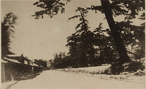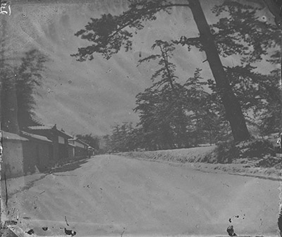 | 見どころ・解説 | 明治6年(1873)に旧上野城内の大名小路を撮影したものである。左手は藤堂藩の上級藩士の屋敷で、長屋門と塀が連続している。右手には扇之芝の空閑地が広がる。大名小路と扇之芝の間には馬場が存在し、大名小路から扇之芝へと馬場を突っ切るような小道があった。写真では、その馬場への侵入口が見当たらないことから、撮影は侵入口より西側、現在の県立上野高等学校前あたりから更に西側を撮影したものと思われ、松の木の奥に藩校崇広堂がわずかに見える。この画像の原板はコロジオン湿板写真ガラスネガで、東京大学史料編纂所の調査によってデジタル化された。明治6年頃に上野城内を撮影したガラスネガは10枚が残され、この写真を含む6枚が伊賀史談会から絵葉書として発行されたが、降雪を確認できるのはこの1枚のみである。 |