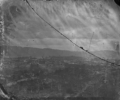 | 見どころ・解説 | 明治6年(1873)頃に上野城下町を撮影したものである。原板はコロジオン湿板写真ガラスネガで、東京大学史料編纂所の調査によってデジタル化された。撮影地点は城下町南方の高台と推定されることから、久米山の丘陵あたりが想定できる。写真中央の樹木が目立つ小高い部分が上野城で、高石垣も確認できる。城郭の左手、白線のように見えるのが長蔵(米蔵)の白壁、長蔵から一段下がって写真の両側に同じような白線が見えるのが、東・西大手門の白壁と思われる。町家の家並からは東西の大手門から南に延びた立町通の道筋をうかがうことができる。町家は、通りに面した部分に瓦葺の家屋を確認できるが、茅葺らしき家屋も見られる。なお、明治4年段階における上野城下町の家数は2,104軒、人口は8,739人である。 |