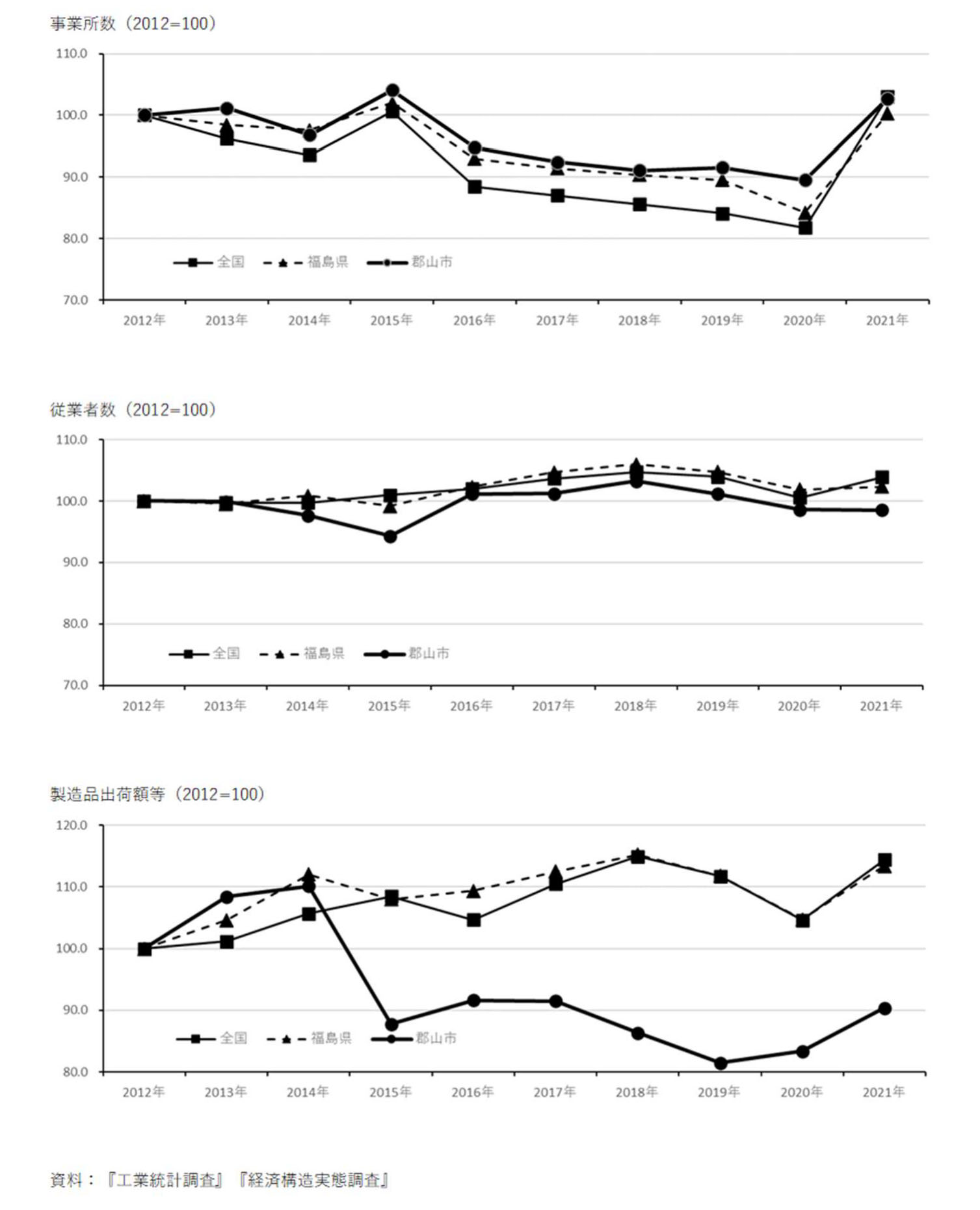 製造品出荷額等の落ち込みは前2指標に比較して、より顕著である。郡山市で2015(平成27)年に90水準を下回るまでに低下し、一時的に回復したものの、2021(令和3年)年においても90水準にとどまっている。