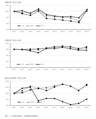 次に、従業者数の推移をみると、全国と福島県がほぼ同水準で推移しているのに対して、郡山市は2015(平成27)年にかけて大きく低下し、2021(令和3)年においても100の水準を回復していない。