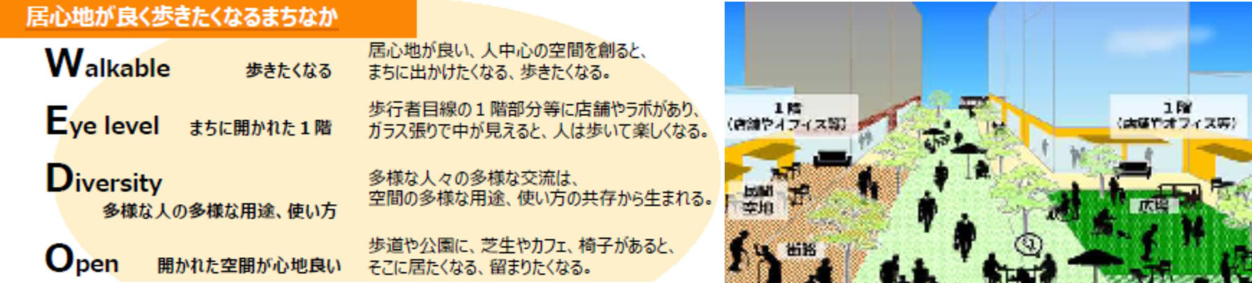 2014(平成26)年に立地適正化計画制度が導入され、コンパクト・プラス・ネットワークの形成に向けた取組が全国で展開されている。一方でこれら政策推進に当たっては、中心地域等へ都市機能を集積させた上で、まちなかを多くの人材の出会いと交流により、地域の消費と投資、雇用を生み出し、豊かで成熟した生活を実現する「都市空間」へと再生していく戦略が求められている。国は、こうした都市経済・社会の「多様性」の促進やその集積・交流を通じた「イノベーション」の創出など、付加価値を創出する「都市」のあり方について検討するため、2019(平成31)年2月に、産学官のメンバーで構成された「都市の多様性とイノベーションの創出に関する懇談会」を設置、同年6月26日に『「居心地が良く歩きたくなるまちなか」からはじまる都市の再生』が取りまとめられ、国土交通大臣へ提言されている。この提言を受け、国土交通省では、1.必要な制度改正等の準備、2.「ウォーカブル推進都市」として取組を進める地方公共団体の募集、3.関係者との政策対話の開始、この3点を実施することとしている。