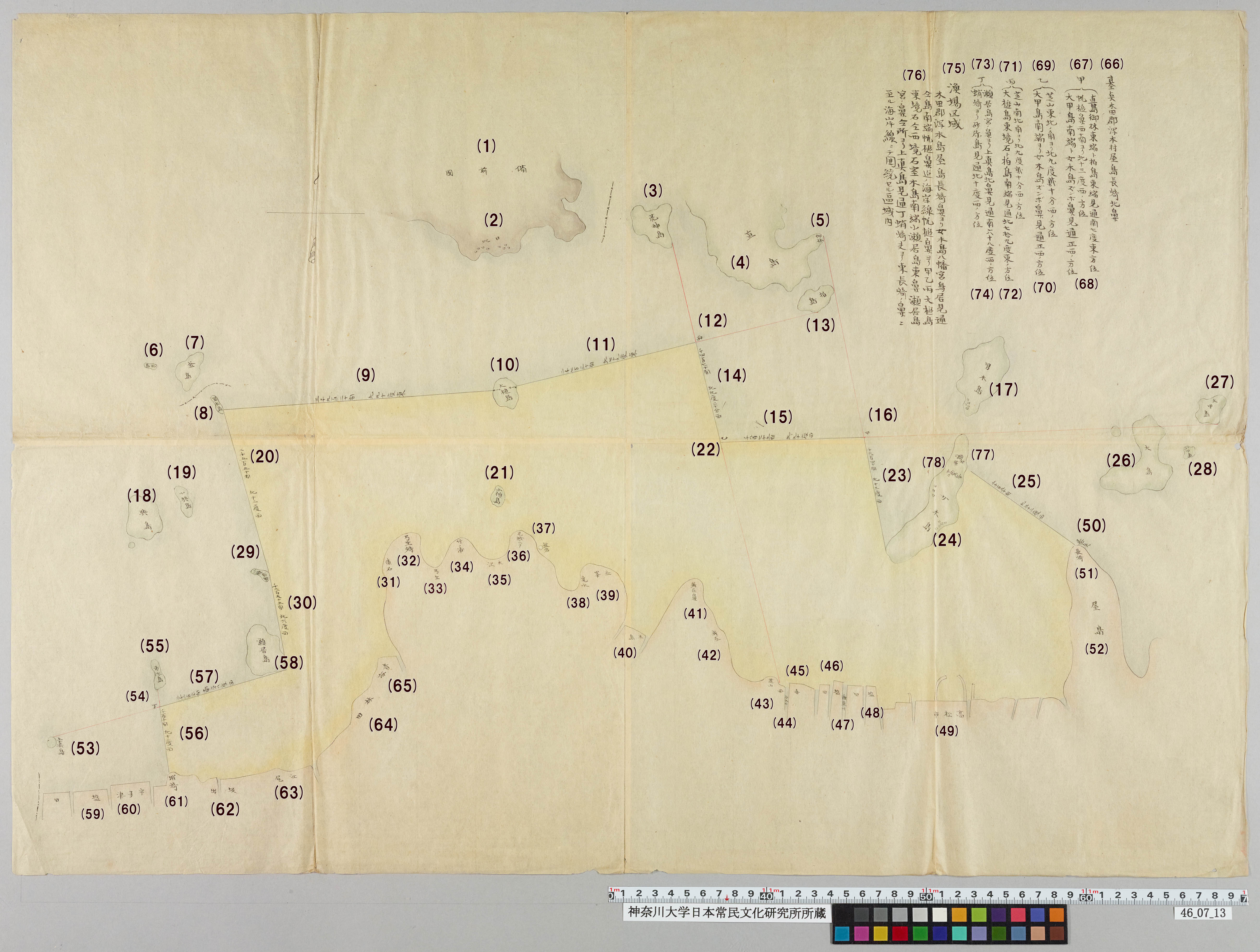 (76)木田郡潟本島屋長崎鼻ヨリ女木島八幡宮鳥居見通 仝島南端帆槌鼻迄ノ海岸線幌槌鼻ヨリ甲乙丙大槌島 東境石仝西境石室木島南端小瀬居島東鼻瀬居島 宮の鼻仝所ヨリ上直島見通丁蛸崎夫ヨリ東長崎ノ鼻ニ 至ル海岸線ニテ囲続セル区域内
