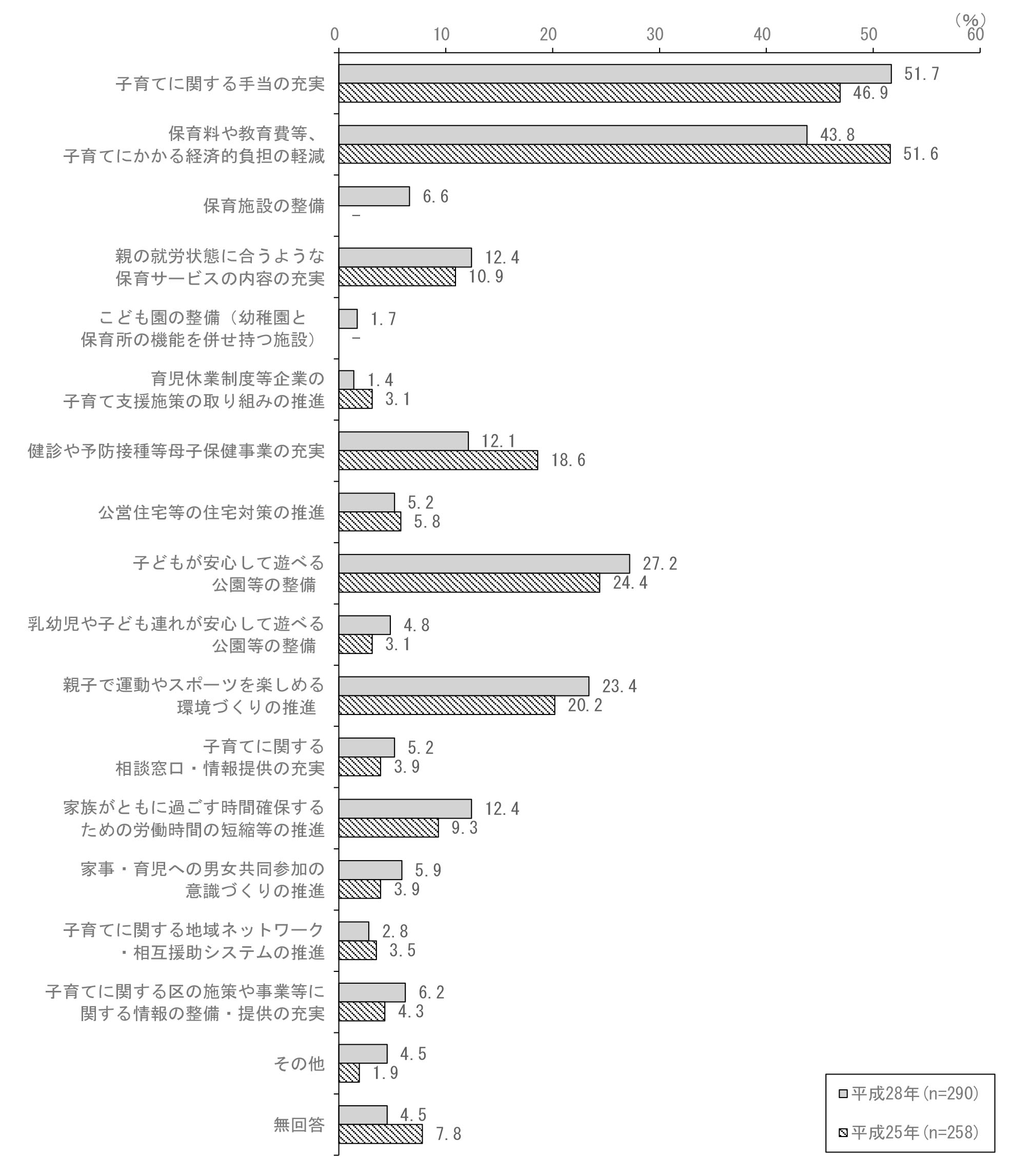 「子育てに関する手当の充実」が51.7%で最も多く、次いで「保育料や教育費等、子育てにかかる経済的負担の軽減」が43.8%である。前回調査より「子育てに関する手当の充実」が4.8ポイント増加し、「保育料や教育費等、子育てにかかる経済的負担の軽減」が7.8ポイント減少した。