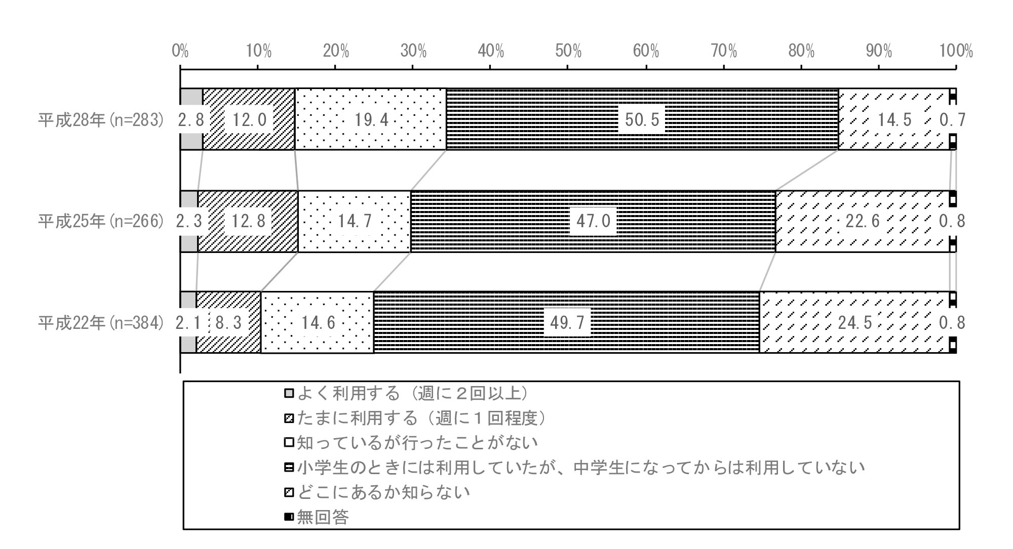 「小学生のときには利用していたが、中学生になってからは利用していない」が50.5%で最も多く、次いで「知っているが行ったことがない」が19.4%である。「よく利用する」と「たまに利用する」を合わせた<利用する>は14.8%である。