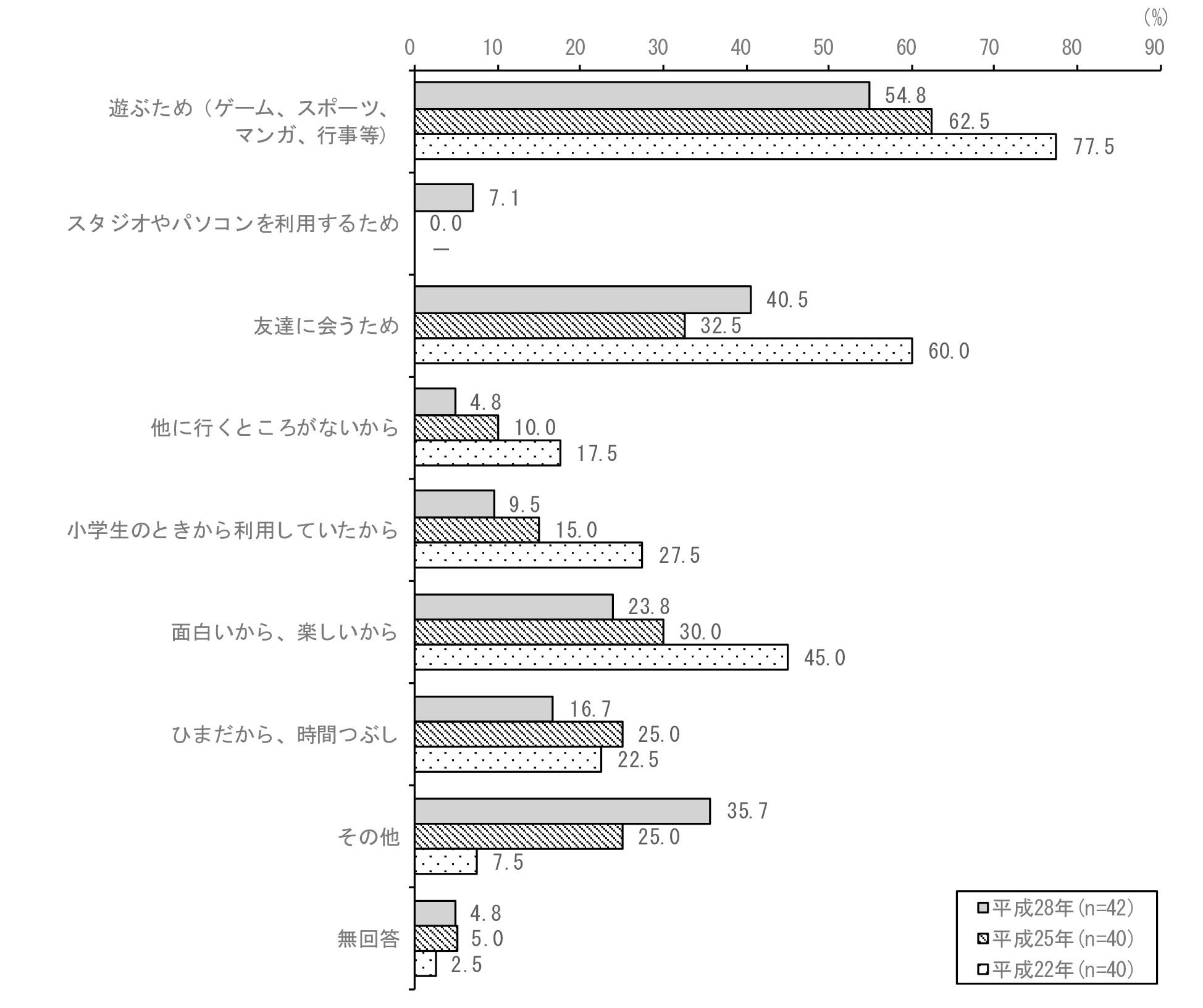 問27で「よく利用する(週に2回以上)」「たまに利用する(週に1回程度)」と回答した人に、児童館や子ども中高生プラザ等に行く目的をたずねたところ、「遊ぶため(ゲーム、スポーツ、マンガ、行事等)」が54.8%で最も多く、次いで「友達に会うため」が40.5%、「面白いから、楽しいから」が23.8%である。「その他」(35.7%)の内容は、勉強するため、図書館で本を借りるため、ダンスやバンド練習のため等である。