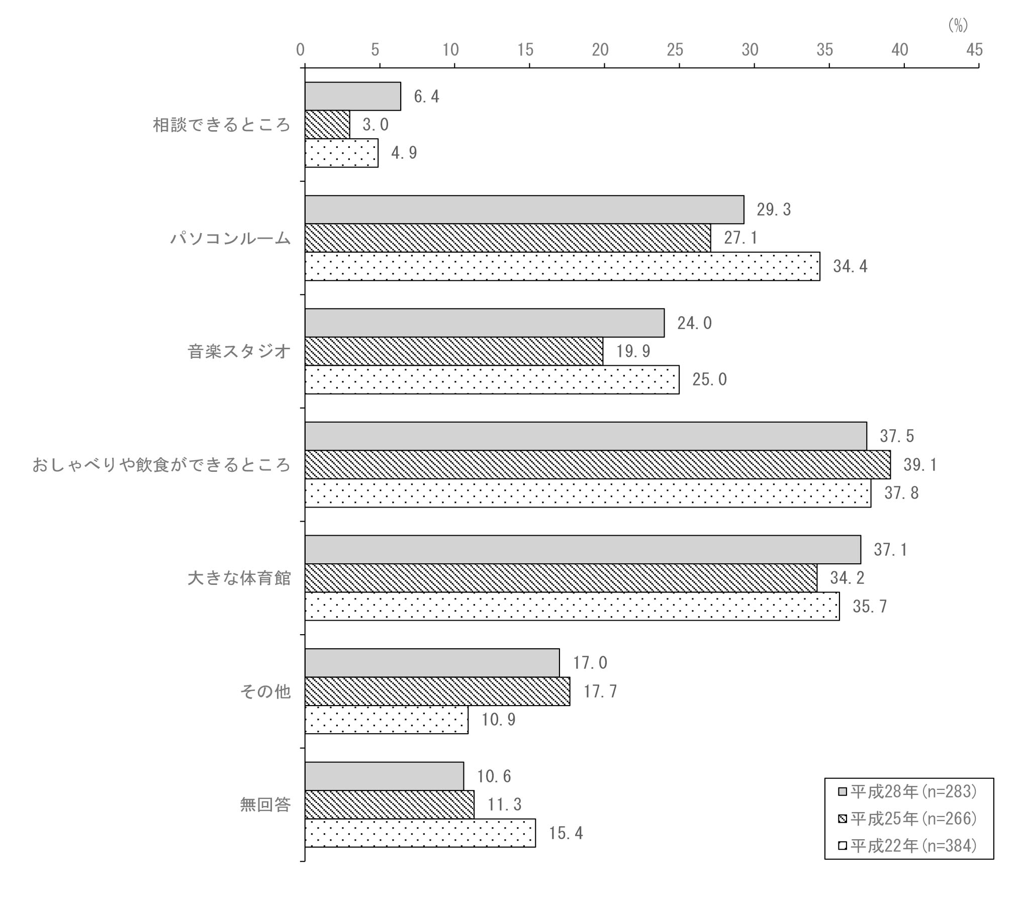「おしゃべりや飲食ができるところ」が37.5%で最も多く、次いで「大きな体育館」が37.1%、「パソコンルーム」が29.3%、「音楽スタジオ」が24.0%である。