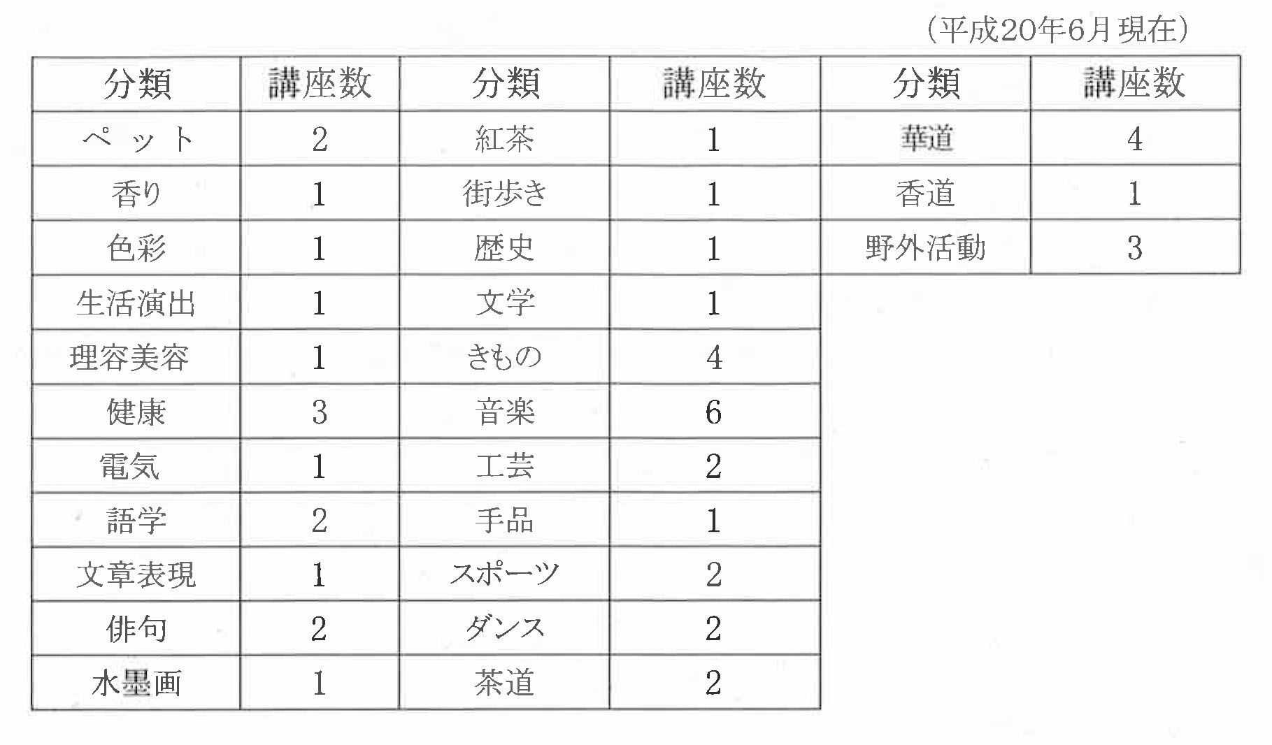 平成20年6月現在の登録講座状況は以下のとおりです。現在の講座内容をみると、プログラムが多様性に欠けているという傾向が伺えます。