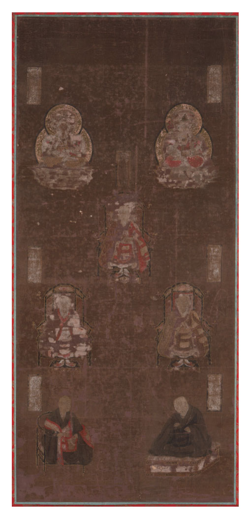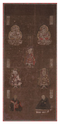 親鸞が定めた浄土真宗の七高僧を描く掛軸で(絹本着色、縦約100cm×横約50cmの規模)、七高僧とはすなわち、龍樹・天親(ともに天竺・インド)、曇鸞・道綽・善導(いずれも震旦・中国)、源信・源空(ともに和朝・日本)である(写真:守綱寺蔵)。親鸞は、阿弥陀如来がすべての人を救うという浄土真宗の教えが、釈迦如来によって説かれ、それをインド・中国・日本の三国(三朝)にわたる7人の高僧が受け継ぎ、伝えて親鸞自身にまで届けられたと考え、『正信偈』や『高僧和讃』などでその内容を説いている。それを絵画で可視化したのが、この七高僧連坐影像であり、戦国時代以降、現在に至るまで真宗寺院本堂の内陣余間に、聖徳太子孝養像とともに掛けられるものである。なお、その軸裏には本願寺等真宗本山の誰がいつどこの誰にこの「三朝高祖像」を授けたのかという情報が記されていることが多く、所蔵する寺院の住職歴代を知る重要な文献史料としても注意すべきである。