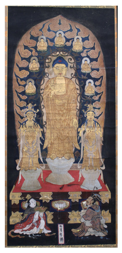 長野市の善光寺の本尊である阿弥陀三尊像(善光寺如来)は三国伝来の生身像(実際の仏と同様の命を宿した像)として、阿弥陀信仰を標榜する諸宗派により全国的な信仰を集めた。三尊全体を一つの舟形光背で覆う「一光三尊」と呼ばれる独特の像容をもつ善光寺如来は、彫刻や絵画として複製され全国の寺院に本尊や什物として蔵されてきた。善光寺如来の由緒と利益を記した縁起は、平安時代末期にはその原型が成立しており、現在のような善光寺如来信仰もその頃普及したと思われる。縁起の内容は3国を舞台とする。最初の舞台は東天竺の毘舎利国。月蓋長者が釈迦を軽んじたために発生した疫病を阿弥陀如来が駆逐する。月蓋長者の発願で、竜宮の霊宝・閻浮檀金に釈迦・阿弥陀両如来の霊気を浴びせて生身仏である善光寺如来が作られる。それから500年後の次の舞台は百済国。月蓋長者の百済転生に応じて善光寺如来は同国へ渡り、512年間百済国を守護する。そして舞台は日本へ移る。日本へ渡った善光寺如来の受け入れをめぐって物部氏と聖徳太子および蘇我氏は対立、ついには戦となり物部氏は滅ぼされる。その30年後、月蓋長者の生まれ変わりとして本田善光が善光寺如来を信濃へ勧請する。息子・善佐は前世の宿縁で地獄堕ちとなりかけるが、善光寺如来のとりなしで蘇生を許される。善佐は同じく地獄堕ちの運命にあった皇極天皇の蘇生を善光寺如来に嘆願する。蘇生を得た皇極天皇により善光・善佐親子は信濃・甲斐の国司に任ぜられ、善光寺を建立する。この縁起に基づいて制作されたのが善光寺如来絵伝で、鎌倉時代後期のものを現存最古本とする中で、三河では鎌倉時代後期から室町時代にかけての善光寺如来絵伝の古本が本證寺(安城市)、妙源寺(岡崎市)、満性寺(岡崎市)といずれも真宗の寺院に伝存する。市域では、善光寺如来像としては、遍照寺(鴛鴨町)に江戸時代末期のものが、版本の善光寺如来像としては高月院(松平町:写真)に弘化2(1845)年開版、遍照寺に江戸時代末期のものが伝存する。両寺はともに浄土宗鎮西派に属する。絵伝としては近代のものが3本確認される。