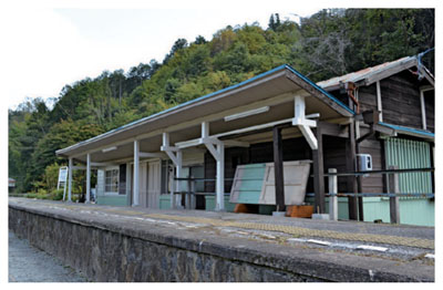 中金町(石野地区)。昭和3(1928)年開業。建物は、木造平屋建、切妻造、鉄板葺(近年まで桟瓦葺)平入、桁行7.5間、梁間2間の長方形、下見板張り、建築面積53.7m2。間取りは待合室、駅員執務室、四畳半の座敷(休憩室)が付いている。駅員執務室から待合室に出改札室を突出させ便利にしている。外部への出入口は南正面国道側と東側妻入のバス発着所の2か所で、吊下げ両引板戸が付いていた。プラットホーム(一線一面)は、全長36m・幅3.6m、花崗岩の切石積。貨物を扱う駅で竹材の積み出しで賑わい、荷車のため片側は斜路となっている。国登録有形文化財。
