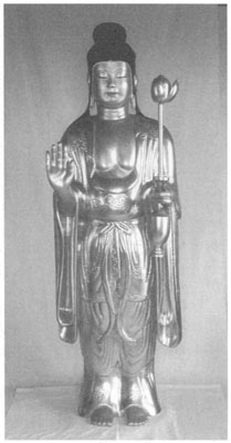 なお、この像はいま観音菩薩として信仰されており、信仰の場ではそれを尊重して継承していくべきだと思うが、造像された当初の尊名は異なると考えられる。頭部を見ると、髻(もとどり)を結(ゆ)って冠をかぶり、確かに菩薩に通ずる顔かたちをしているものの、服装は菩薩のものではない。菩薩は、下半身には裙(くん)という巻スカート状の衣を着け、上半身には条帛(じょうはく)という一本の帯状の布を、左肩から右脇へと襷(たすき)のように掛けるのが基本であるが、この像が裙を着けたのちに上からまとっているのは、大きく体を覆う、華やかでゆったりとした袖のある衣である。仏像の尊名を判断する着眼点としては、髪型、顔立ち、服装や装身具、手の数やかたち、持物(じもつ)や台座のかたちなどが挙げられるのであるが、服装から菩薩ではないらしいことが分かるとはいえ、この像は両手先と持物がともに後補であることから、結局のところ尊名は、現時点で確定することは困難だということになる。ただあえて言うならば、広く古仏を見渡したとき、平安時代前期の吉祥天像(きっしょうてんぞう)の中に像容に類似点のあるものが見受けられ、またこの頃には、神仏習合思想を背景に成立したとされる、吉祥天同様の姿をした、薬師如来の異形像の存在が指摘されていることなどから、そのような像である可能性を考えることはできる。そして、今は境界をはさんで隣の豊津町に所在しているのであるが、直線距離で二・五キロメートル程と、すぐ近くにある豊前国府跡や国分寺などは、このような像が成立し得る環境を構成していた、大きな要素である可能性をもった存在として、注意をしておかねばならないだろう。